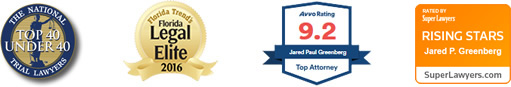 Jared P. Greenberg is a partner at Greenberg & Strelitz, P.A. Mr. Greenberg has been a member of the Florida Bar since 2009. He has also been admitted to practice before the United State District Court Southern District of Florida and the United States District Court Middle District of Florida. Mr. Greenberg practices in the area of personal injury and defective products, including: motor vehicle accidents, trucking accidents, motorcycle accidents, bicycle accidents, wrongful death, slip and fall accidents, premises liability, dog bites, contaminated food, nursing home neglect, and cruise ship injuries. Mr. Greenberg was named one of the top 40 attorneys under 40 for Civil Plaintiff trial attorneys in the state of Florida by The National Trial Lawyers organization in 2017, 2018 and 2019. He is also AV Preeminent ® Peer Review Rated by Martindale-Hubbell® (representing the highest designation for quality and ethics awarded by Martindale-Hubbell), and in 2012 and 2016 was named to Florida Trend’s Legal Elite as a Top Up & Comer. Most recently, Mr. Greenberg was selected to the 2018 and 2019 Super Lawyers-Florida Rising Stars list.